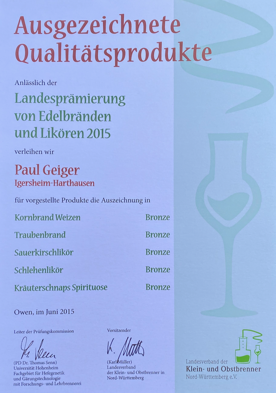 Im Jahr 2015 bei der Landesprämierung von Edelbränden und Likören in Baden-Württemberg mit dem Prädikat "BRONZE" ausgezeichnet.