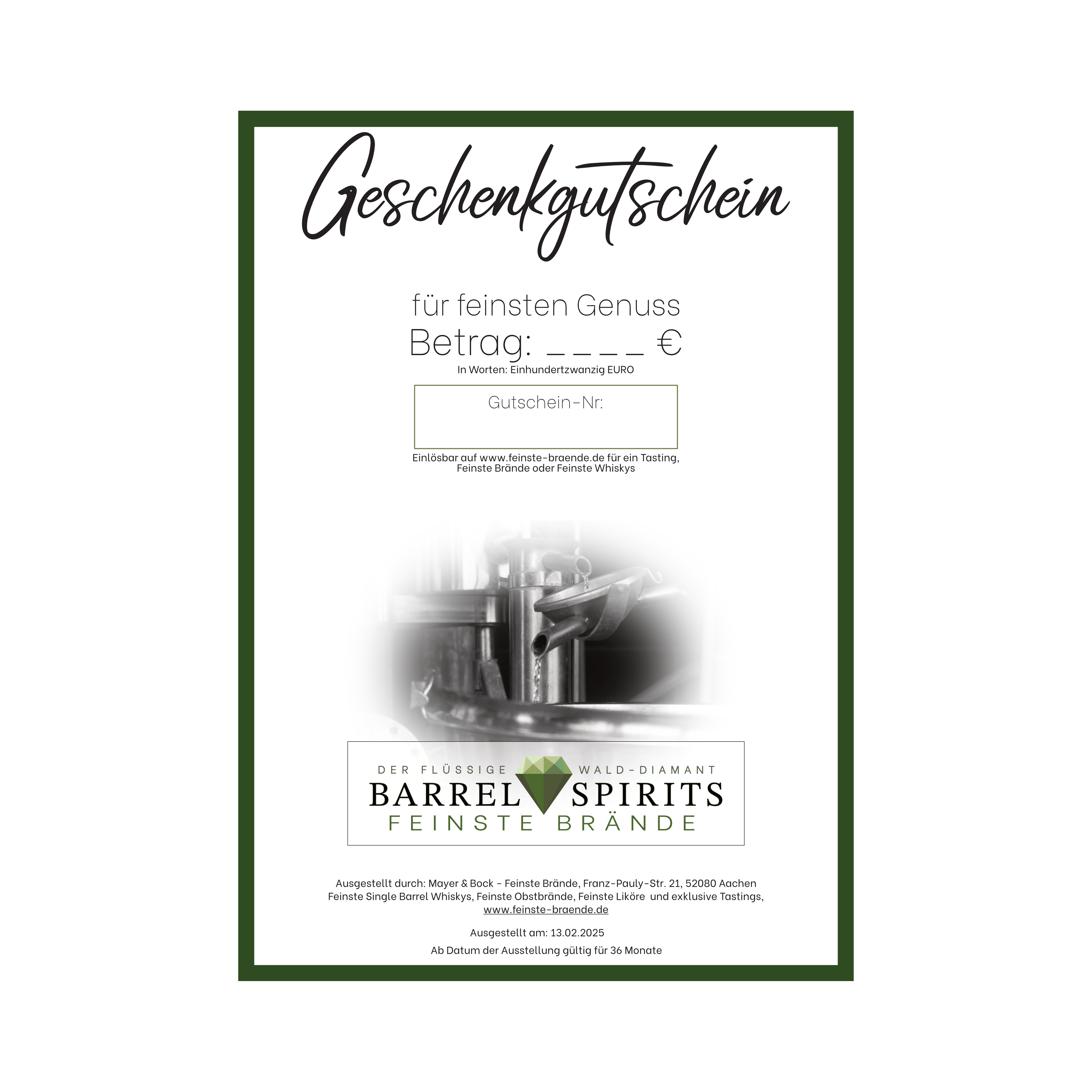 Der Gutschein ist einlösbar für alle Produkte und Leistungen in unserem Online-Shop, egal ob Obstbrand, Whisky, Likör oder auch Tastings. Wählen Sie zum Kauf einfach den gewünschten Gutscheinwert aus oder melden Sie sich gerne bei uns, falls Sie einen individuellen Wert wünschen!
